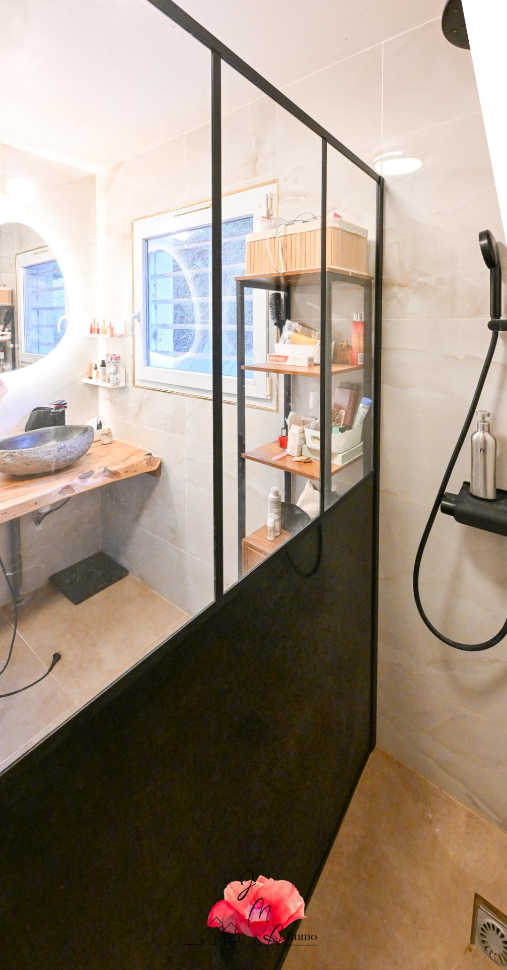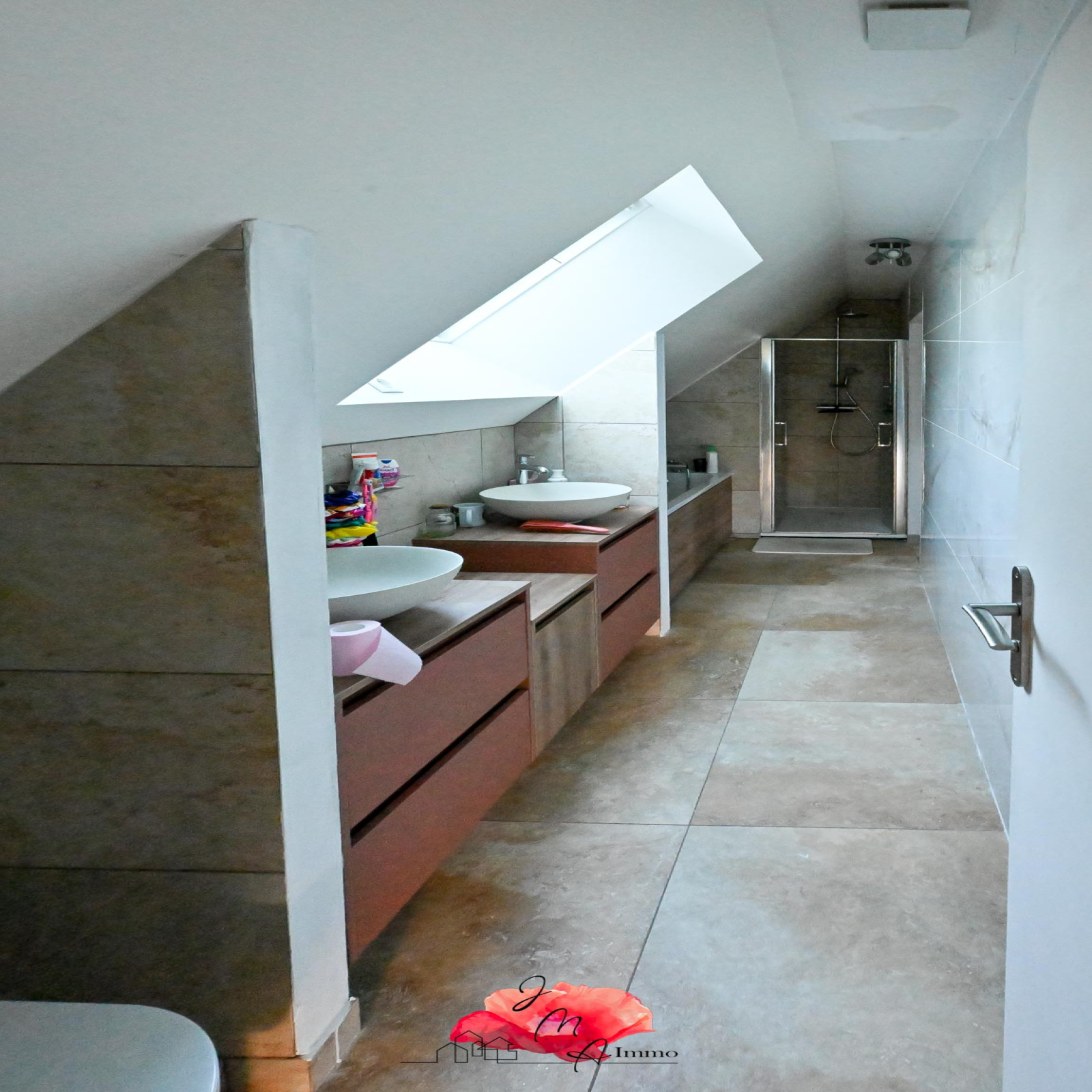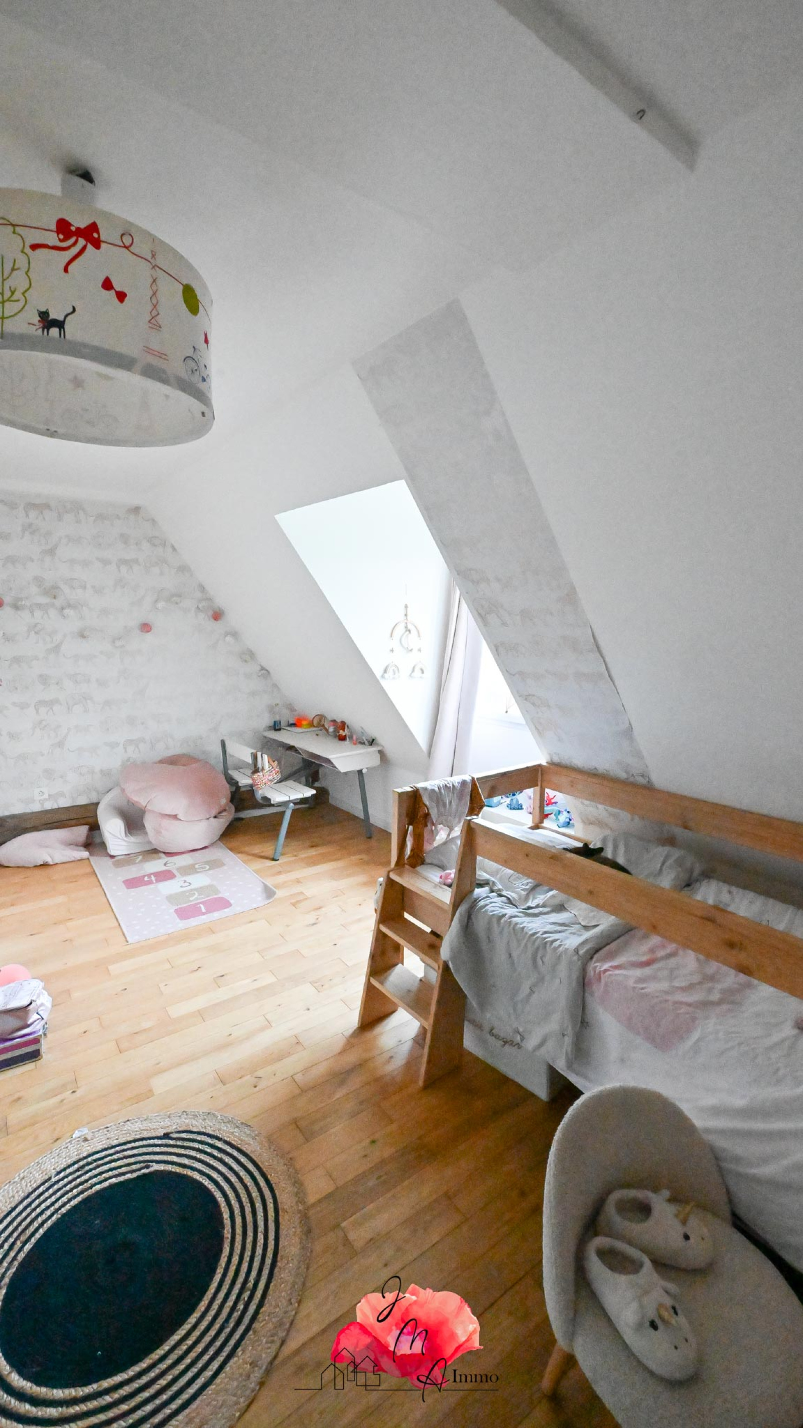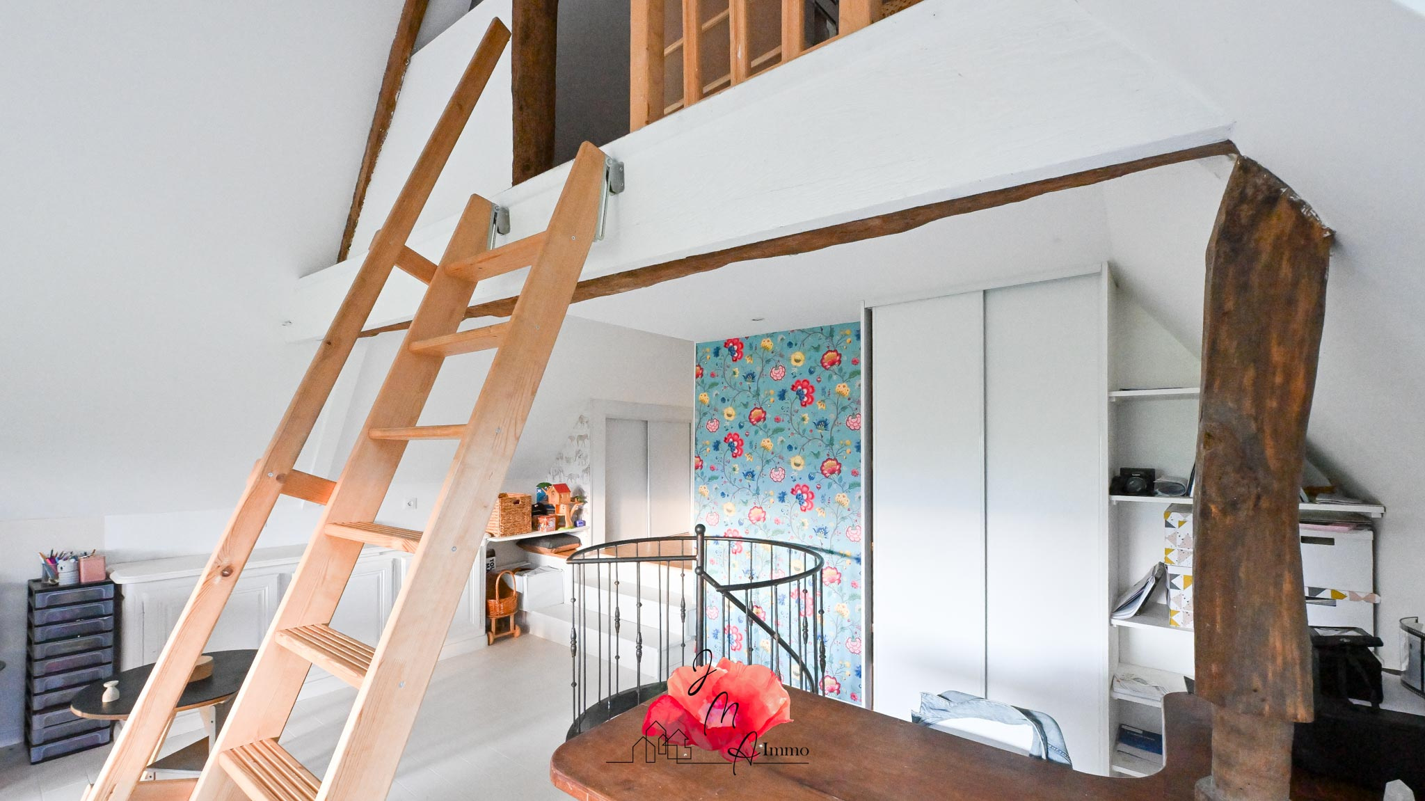 L’étage accueille trois chambres, dont une suite parentale, une salle de bains avec douche et WC, ainsi qu’une mezzanine spacieuse dominant le salon et donnant accès à la terrasse.