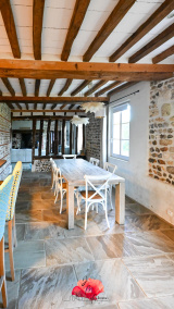 À l’intérieur, la maison conjugue authenticité et confort moderne. Vous découvrirez deux grands salons : l’un doté d’une cheminée Polyflam, l’autre d’un poêle à bois, créant deux atmosphères chaleureuses et conviviales.