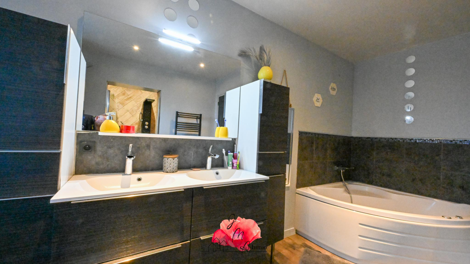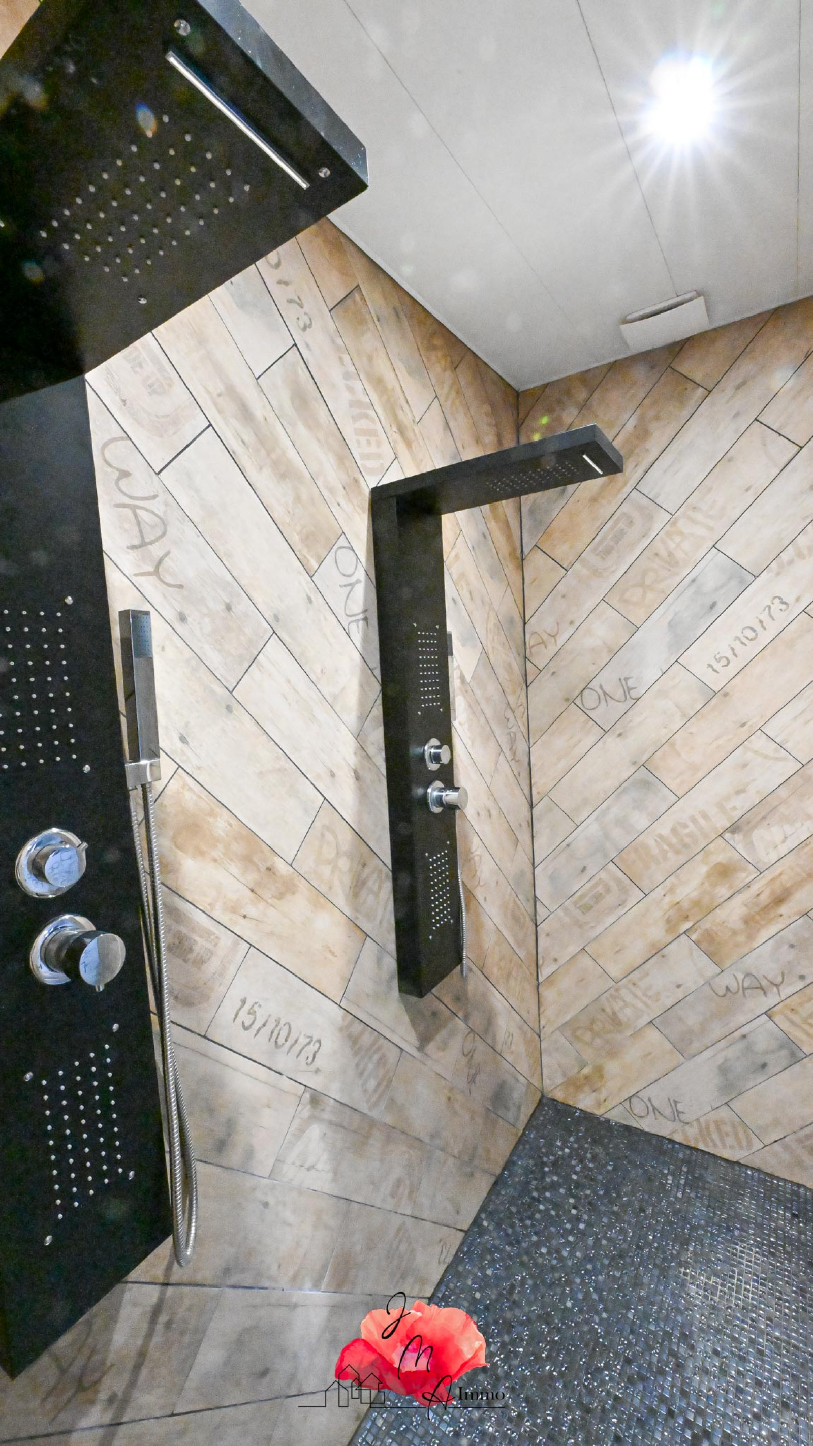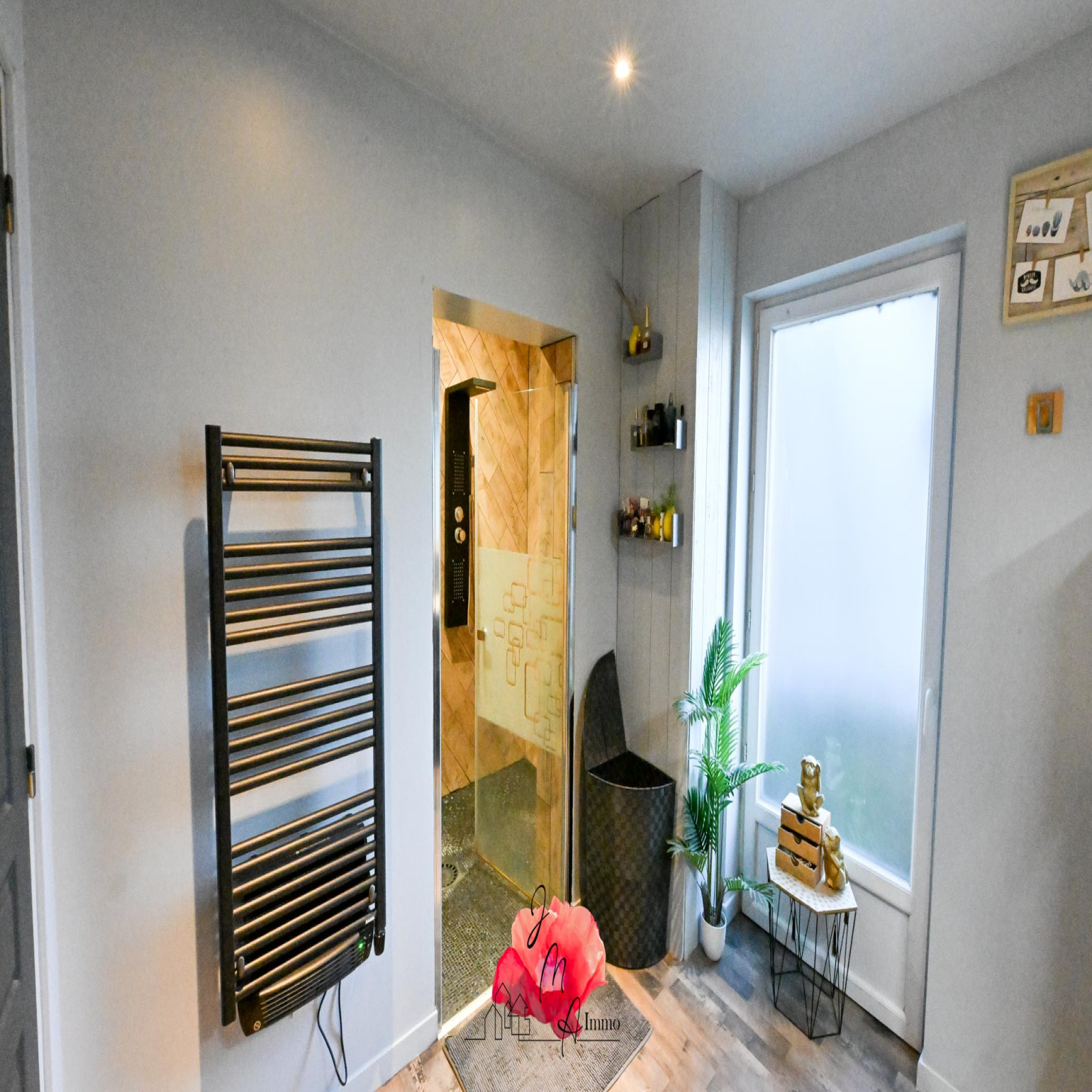 - Une grande salle de bains équipée d’une douche et d’une baignoire.