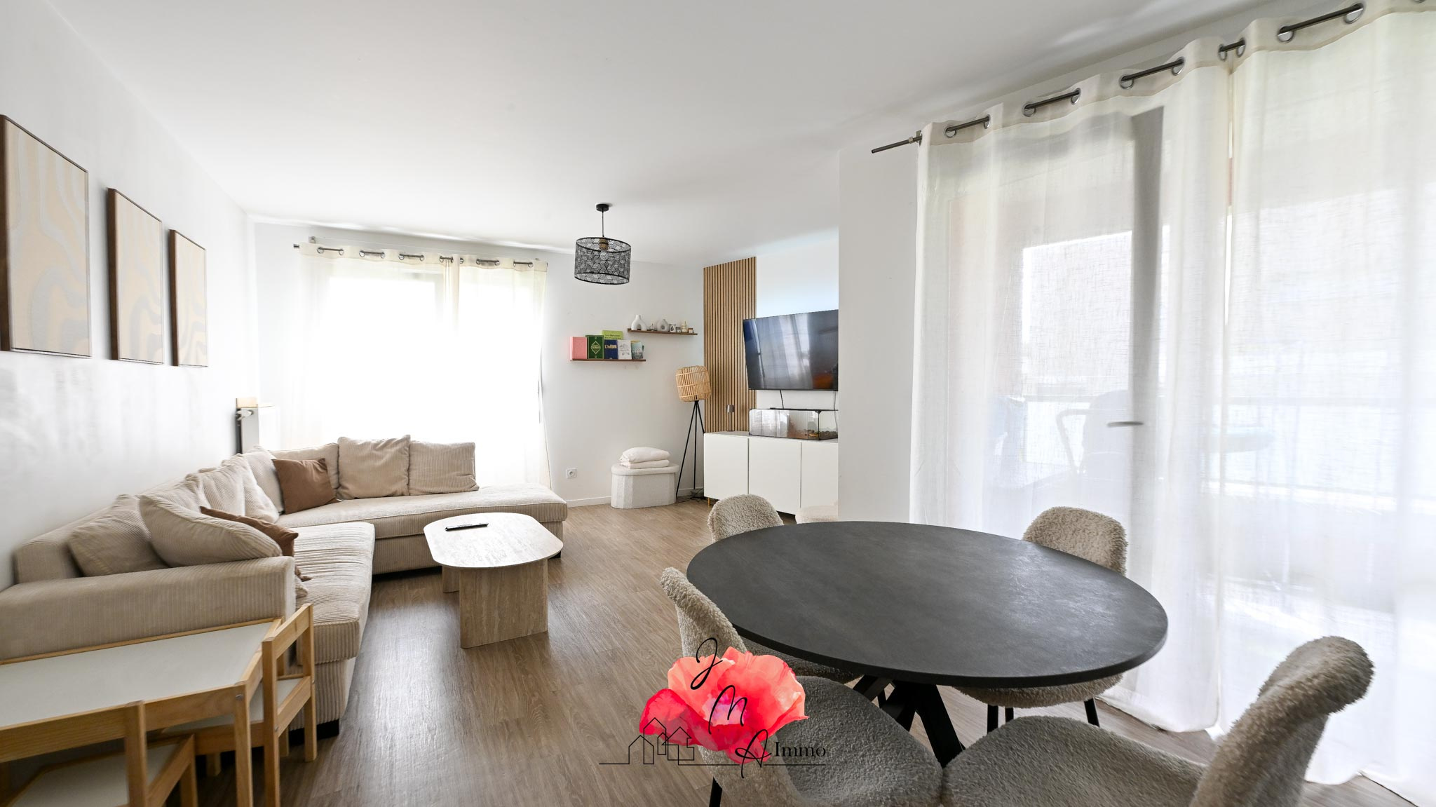 La pièce de vie, baignée de lumière, offre une ambiance chaleureuse avec sa cuisine ouverte sur le séjour/salon, prolongée par un agréable balcon, idéal pour vos moments de détente.