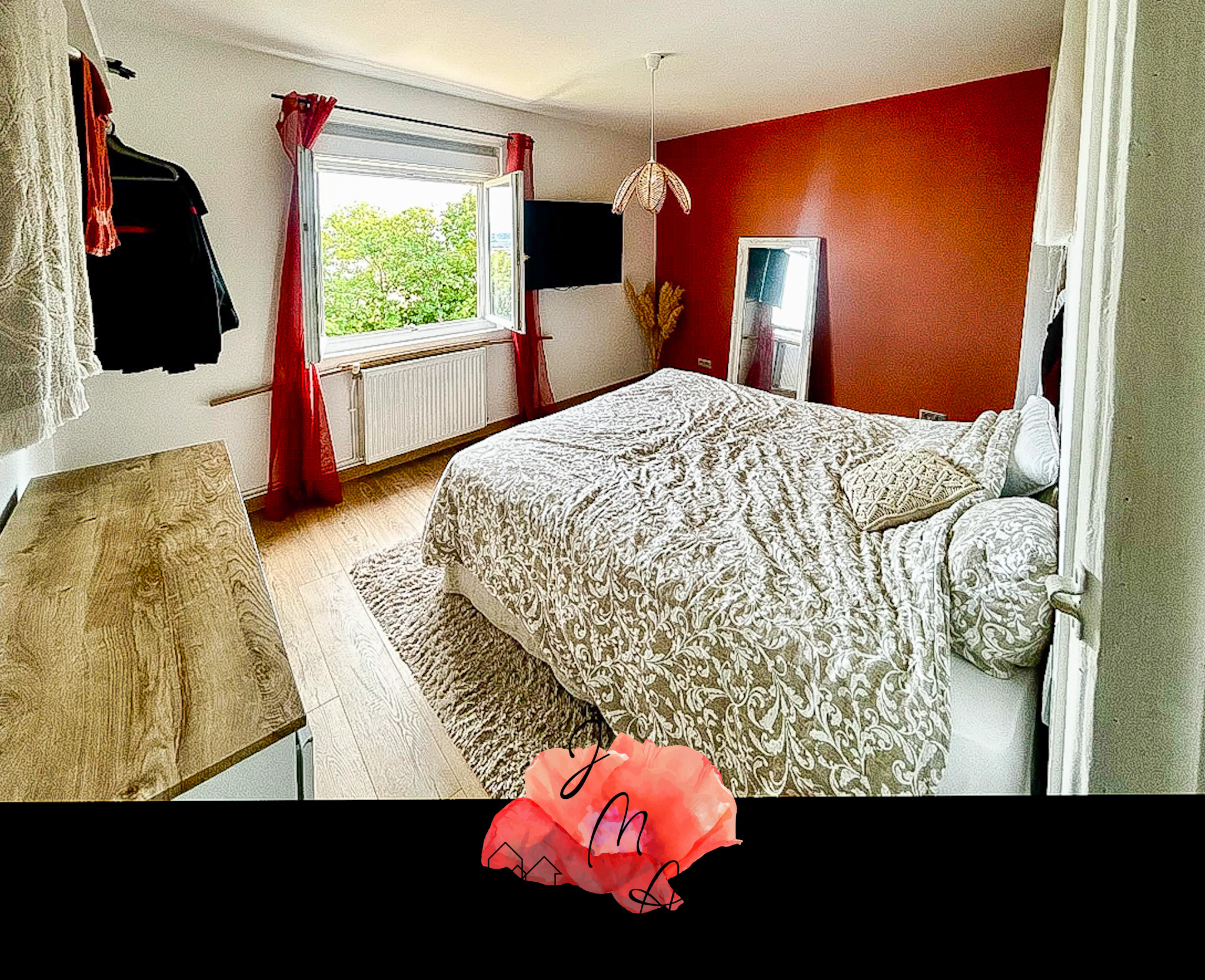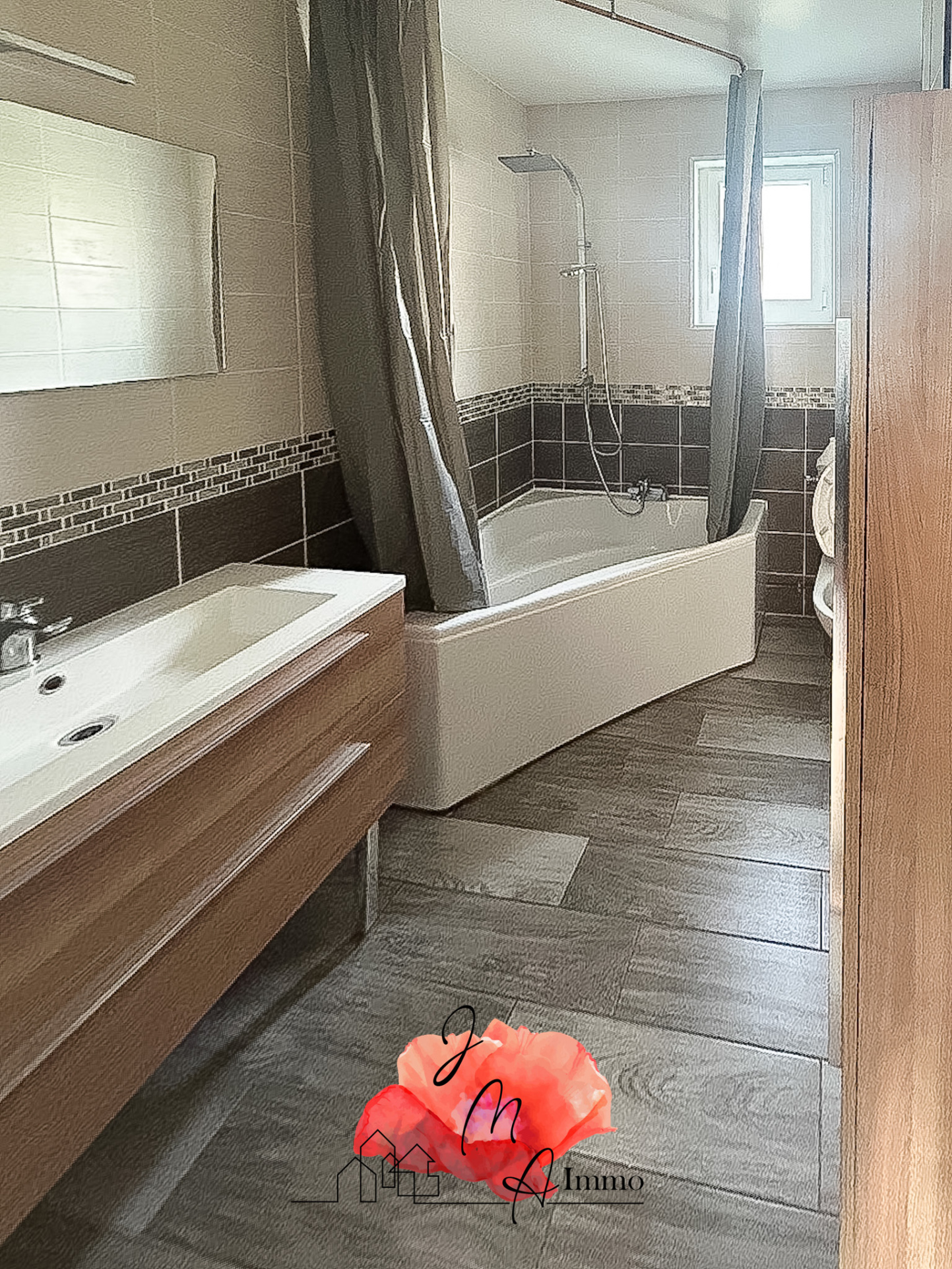 À l’étage, le palier dessert deux chambres, dont une belle chambre de 16 m², ainsi qu’une salle de bain avec baignoire, offrant un agencement confortable et bien pensé.