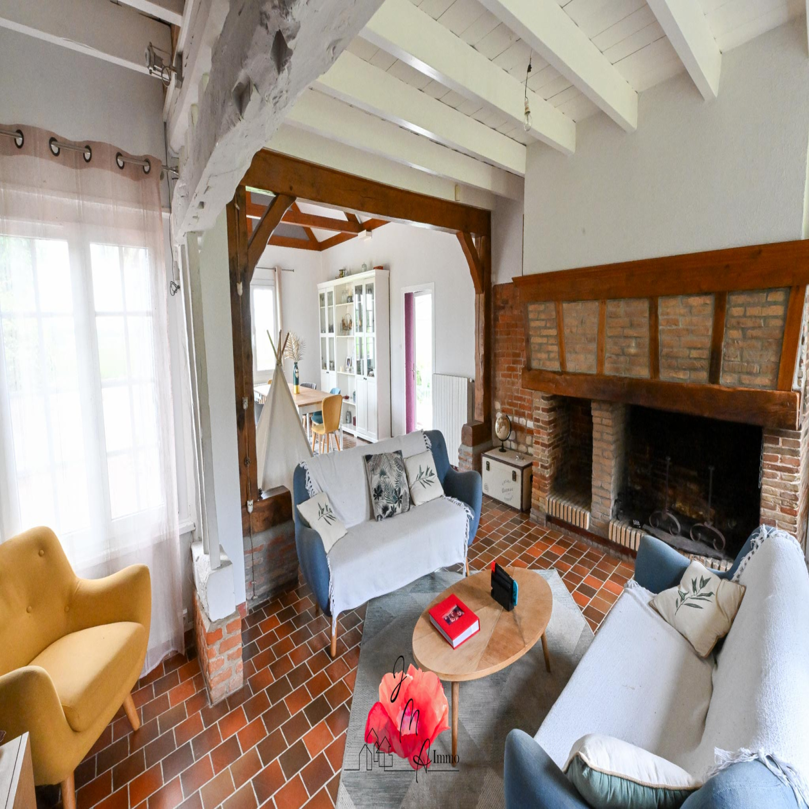 Dès l’entrée, vous serez séduit par la très grande pièce de vie, baignée de lumière et chaleureusement animée par une cheminée authentique qui trône au centre de l’espace.