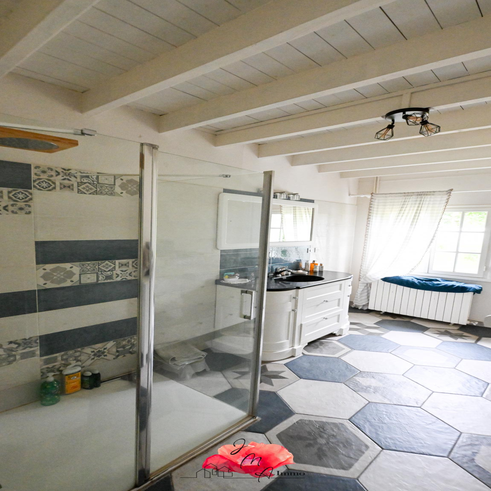 La maison propose deux chambres en rez-de-chaussée, dont une suite parentale exceptionnelle avec un immense dressing et deux salles de bains indépendantes, toutes deux équipées de douches, pour un confort optimal.