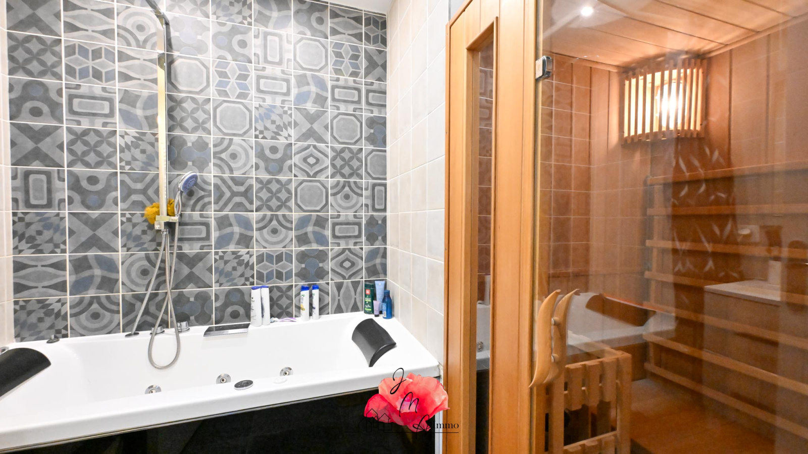 Une salle de bains avec baignoire balnéo et sauna promet des instants de détente inégalés.