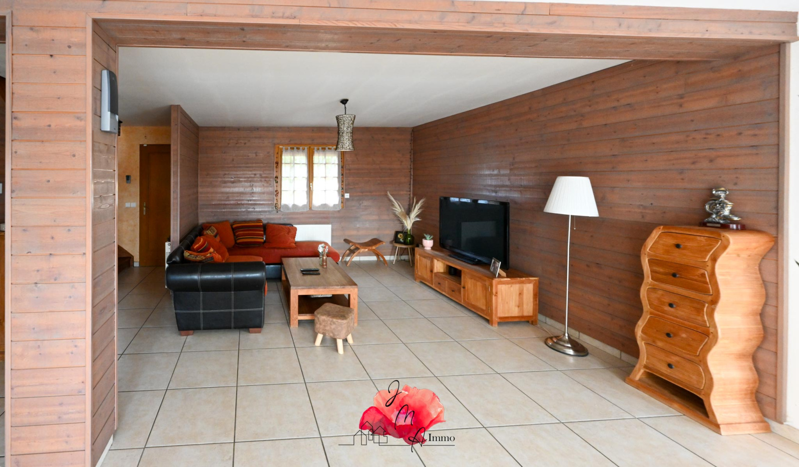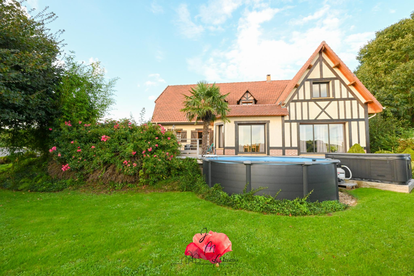 Les baies vitrées ouvrent sur une terrasse en bois de 60 M2 agencée avec piscine hors sol, jacuzzi 6 personnes et une élégante verdure pour lui donner un coin douillet.
